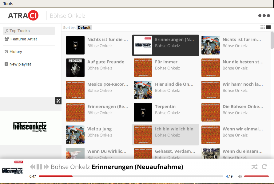 Atraci es una aplicación para Windows, Mac y Linux que le permite escuchar al instante a más de 60 millones de canciones (mucho más que el iTunes de 26 millones). No requiere de registro, no muestra anuncios y es 100% seguro. Creemos que la escucha de la música siempre debe ser libre y accesible a todos, y que sólo el ser dueño de ella debe tener un costo. También creemos que el software útil y de código abierto simplemente no puede morir. Únete a nosotros y contribuir a github.com / Atraci / Atraci. No te olvides de compartir el amor; puede que no necesite Atraci pero algunos de sus amigos podría.