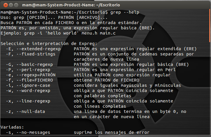 Usualmente, grep toma una expresión regular de la línea de comandos, lee la entrada estándar o una lista de archivos, e imprime las líneas que contengan coincidencias para la expresión regular.
