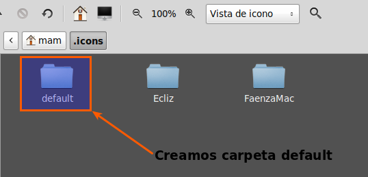 Vamos a nuestra carpeta personal y pulsamos Ctrl + H para ver archivos ocultos. Entramos en .icons y creamos una carpeta llamada default: