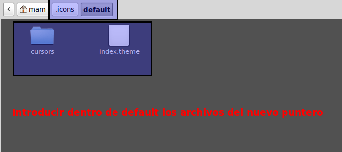 Una vez creada la carpeta default introducimos la carpeta y el archivo index.theme del nuevo cursor en su interior.