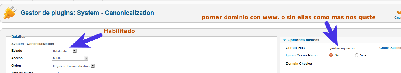 Colocamos la opcion de publicado, y en la casilla vacia "Correct Host" ponemos el que mas nos guste que se vea, o con las tres www. o sin ellas guardamos los cambios,