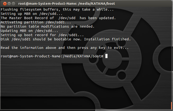 Despues de descomprimir el archivo katana.rar en el pendrive, para hacerlo booteable, se necesita ejecutar en el pendrive el archivo ./bootinst.sh localizado en la carpeta /boot del usb.