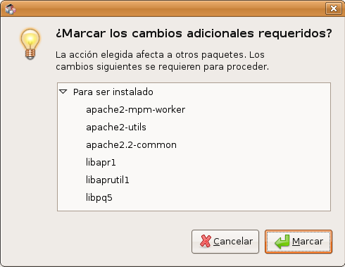 Como el sistema encuentra más paquetes relacionados con la instalación de “apache2”, nos avisa y decidimos “Marcar” para seleccionar también esos paquetes necesarios.