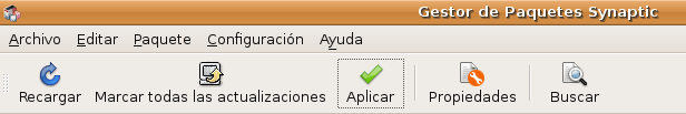 7 Y una vez que los tenemos todos seleccionados, decidimos que se inicie la descarga e instalación de los paquetes, seleccionando “Aplicar” en la barra de herramientas de “Synaptic”.