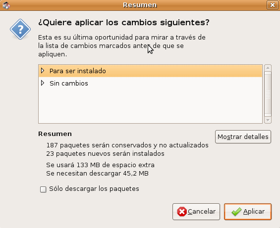 El sistema nos pregunta si queremos aplicar los cambios con la indicación del número de paquetes que serán instalados y la capacidad de la descarga que se realizará.