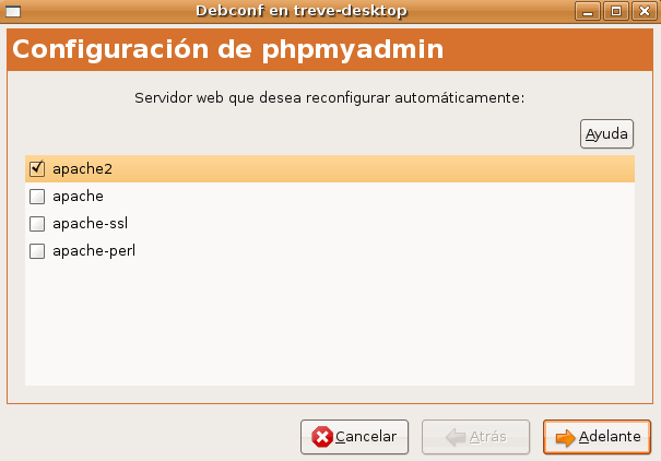 Y se nos pregunta qué servidor web será reconfigurado para poder utilizar phpMyAdmin. Elegimos “apache2”.