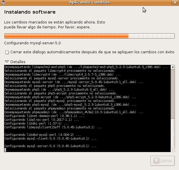 Durante este proceso el sistema nos pide una contraseña para el usuario “root” de “mysql-server-5.0” o, lo que es lo mismo, del único usuario que existe por defecto con posibilidades de acceso y gestión de las bases de datos MySQL, y que será el que utilicemos para acceder en primera instancia a la administración de estas bases de datos con phpMyAdmin.
