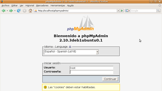 9 Accedemos a la gestión de phpMyAdmin a través de nuestro navegador web escribiendo la URLhttp://localhost/phpmyadmin/