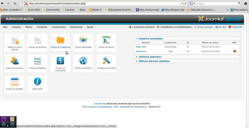 Ahora ya tenéis instalado joomla ya podéis dirigiros a administración y empezar a meterle traya a vuestro sitio web.En la parte superior derecha encontráis dos botones SITIO y ADMINISTRADOR.