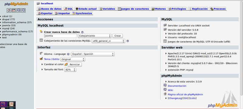 5º Ahora nos vamos a Localhost y en phpmyadmin creamos una base de datos de nombre joomla y con codificación utf8-general-ci: