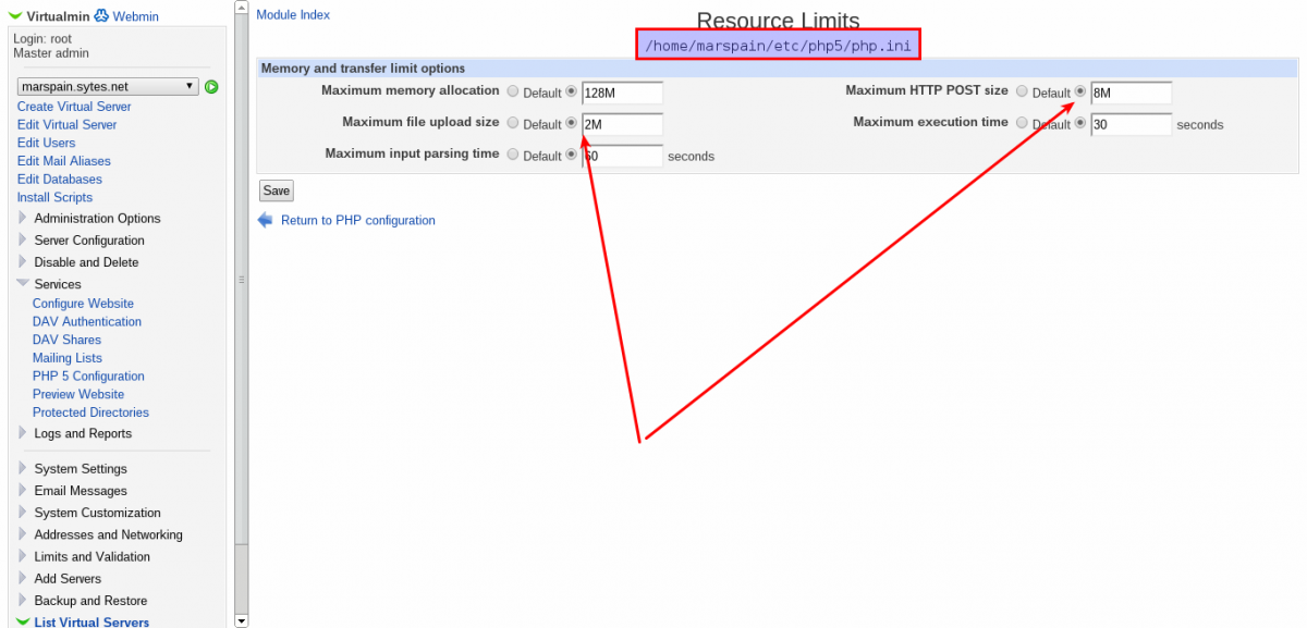 Con virtualmin & webmin para establecer el max , min en megas de los archivos que pueden subir al server no basta con editar el php.ini ya que cada servidor virtual tiene su propio archivo y cada uno puede tener una configuración distinta. Desde el propio panel tenemos acceso a esta opción. Capturas de pantalla: