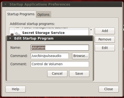En el nombre escribimos: Volumen En comando: /usr/bin/pulseaudio Descripcición: Control de Volumen