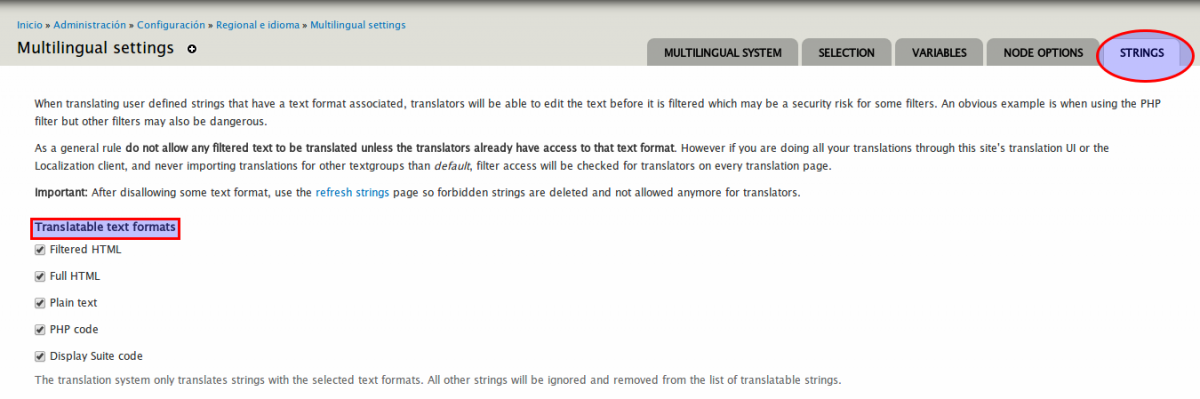 Ahora nos vamos a la administración de drupal y en la configuración de idiomas seleccionamos los tipos de texto que se podrán traducir, Multilingual Settings / Strings, en imagen.
